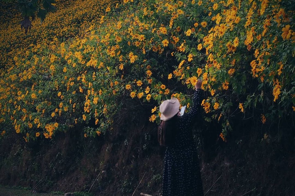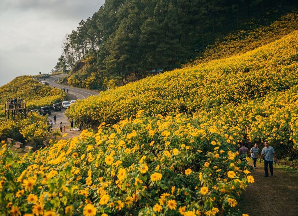 Vào mùa hoa nở rộ, nhiều đoàn xe nối đuôi nhau trên đoạn đường đèo để ngắm cảnh. Du khách mạo hiểm đứng giữa đường để chụp hình. 2 thời điểm đẹp nhất để ngắm hoa trong ngày là buổi sớm khi bình minh vừa lên và lúc chiều tà. Bạn sẽ được ngắm đồi hoa vàng rực, được phủ lớp nắng dịu nhẹ, trong trẻo vào sáng sớm. Khi hoàng hôn buông xuống, cả ngọn đồi hoa vàng chìm trong sắc hồng tím, tạo khung cảnh huyền ảo. Ảnh: totay168, elle_bearkung.