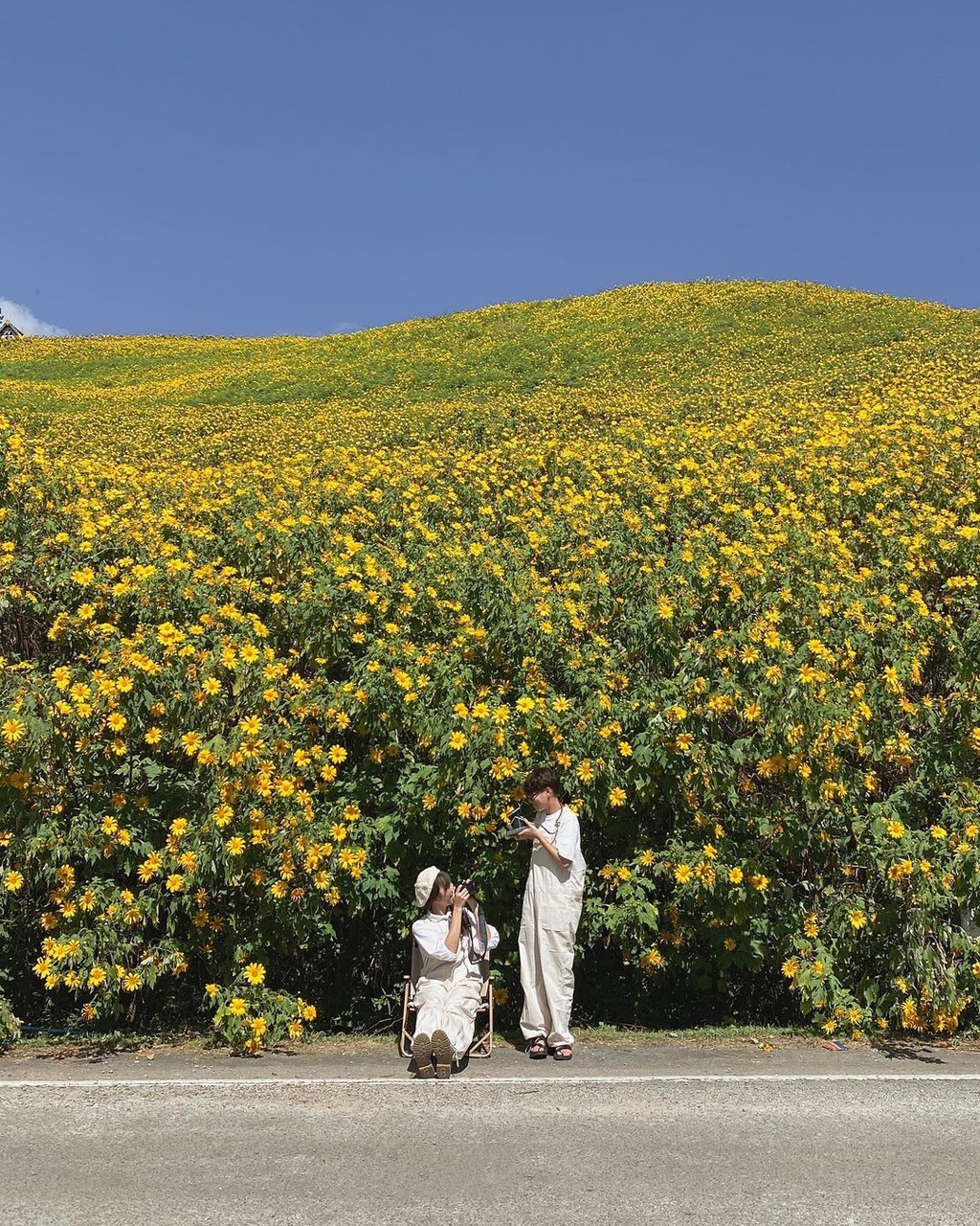 Mặc dù đồi hoa nằm bên khu vực đường cua, dốc, nhiều du khách vẫn không ngại dừng lại để "sống ảo" với đồng hoa vàng rực. Để đến Mae Hong Son, du khách có thể đi xe khách hoặc bay từ Chiang Mai. Ảnh: kengstic_4.