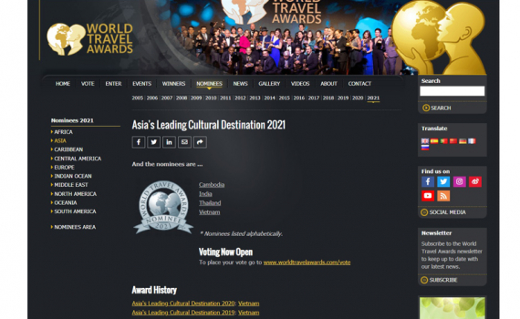 Riêng hạng mục "Điểm đến thành phố văn hóa hàng đầu châu Á" (Asia's Leading Cultural City Destination 2021), Việt Nam có hai đại diện thành ứng viên của hạng mục này là TP Hội An và TP Huế.