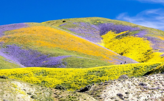 Trên hình là một ngọn núi phủ đầy hoa chụp vào năm 2017 tại Khu tưởng niệm Quốc gia Carrizo Plain của bang California. Bob Wick chia sẻ: "Thung lũng được trải thảm màu rực rỡ của các loài hoa phacelia và tidy tip đang nở. Nhưng nổi trội hơn phải nói tới dãy Temblor được tô bằng các dải màu vàng cam, tím hệt như một trang trong sách tranh".