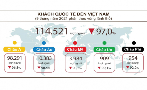 Trong 9 tháng năm 2021, khách đến từ châu Á vẫn cao nhất với 98.291 lượt khách, giảm 96,5% so với cùng kỳ năm ngoái. Khách đến từ châu Âu đạt 10.382 lượt người, giảm 98,4%. Khách đến từ châu Mỹ đạt 3.984 lượt người, giảm 98,3%.