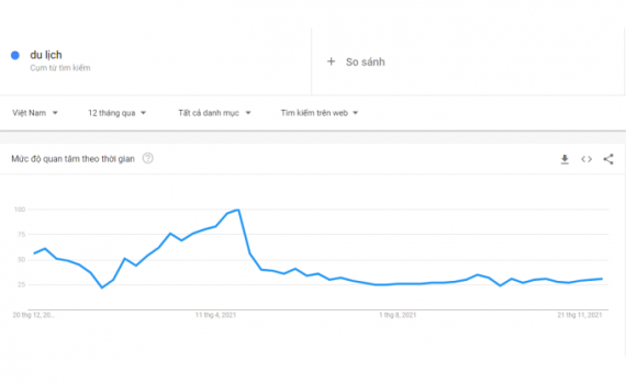 Biểu đồ dữ liệu 12 tháng của năm 2021 cho thấy xu hướng tìm kiếm về từ khóa du lịch biến thiên theo tình hình Covid-19, sụt giảm mạnh vào đợt bùng phát tháng 5, ngay sau khi được tìm kiếm mạnh vào tháng 4, dịp nghỉ lễ 30/4-1/5. Từ đó cho đến nay, xu hướng tìm kiếm du lịch vẫn đi ngang và không thay đổi, dù các hạn chế đi lại đã được dỡ bỏ và dịp Giáng sinh, Tết Dương lịch đang tới gần.