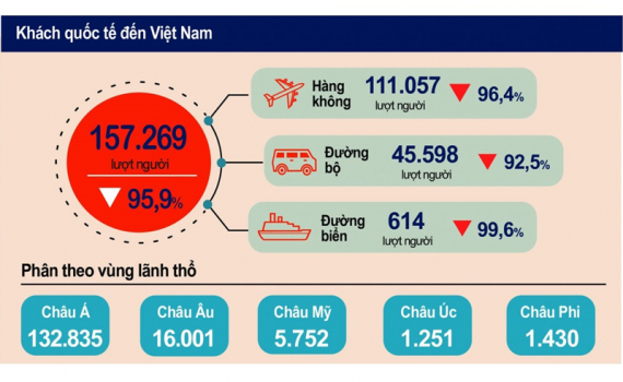 Cụ thể, dựa trên báo cáo của Cục Cửa khẩu, Bộ Tư lệnh Bộ đội Biên phòng, Bộ Quốc phòng và Cục Quản lý xuất nhập cảnh, Bộ Công an, Tổng cục Thống kê cho biết, tính chung năm 2021, khách quốc tế đến nước ta ước đạt 157,3 nghìn lượt người, giảm 95,9% so với năm trước và giảm 99,1% so với năm 2019. Đối tượng khách quốc tế chủ yếu là các chuyên gia, lao động kỹ thuật nước ngoài làm việc tại các dự án ở Việt Nam.