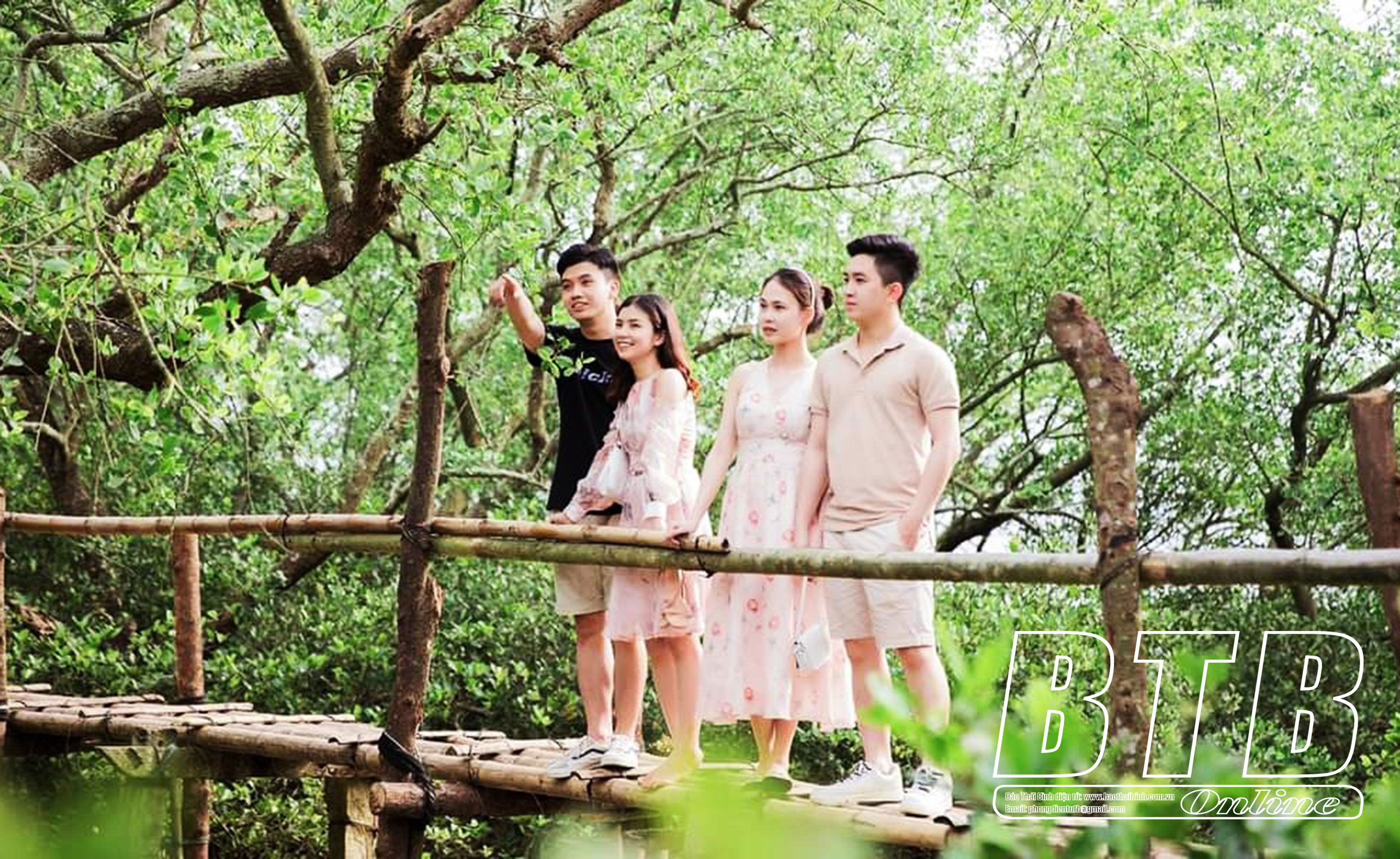 Du khách tham quan, trải nghiệm cầu tre xuyên rừng ngập mặn tại khu du lịch sinh thái cồn Đen (xã Thái Đô, huyện Thái Thụy).