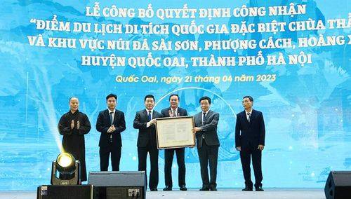 Phó Chủ tịch Thường trực UBND thành phố Hà Nội Lê Hồng Sơn trao quyết định công nhận điểm du lịch Di tích quốc gia đặc biệt chùa Thầy, Quốc Oai
