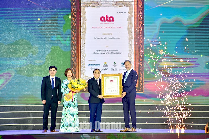 Nhân dịp này, đại diện Văn phòng UN-Habitat khu vực châu Á-Thái Bình Dương trao Giải thưởng Phong cảnh thành phố Châu Á năm 2022 cho công trình “Quảng trường Nguyễn Tất Thành - Tinh hoa của núi rừng”.