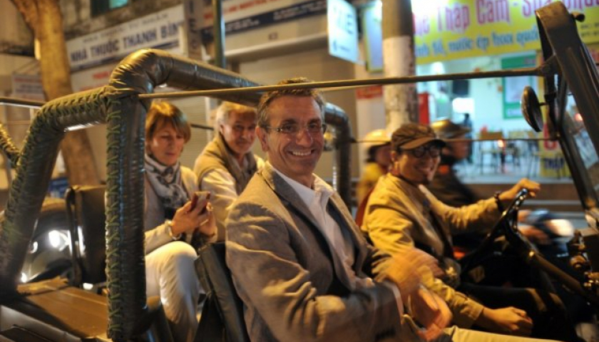 Du khách nước ngoài ngồi xe jeep, tham quan đường phố Hà Nội vào buổi tối. Ảnh: Hoàng Nam