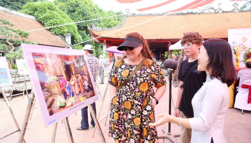 Du khách tham quan Triển lãm ảnh “Hà Nội - 15 năm mở rộng địa giới hành chính” tại Văn Miếu - Quốc Tử Giám.