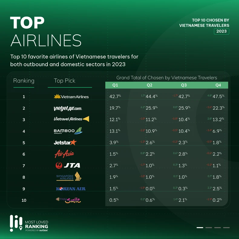 Trong suốt 4 quý, tỷ lệ bình chọn của hai hãng này luôn đạt top đầu, chiếm tổng hơn 60% tỷ lệ bình chọn từ du khách Việt. Hai hãng hàng không nội địa phổ biến còn lại Vietravel Airlines và Bamboo Airways.