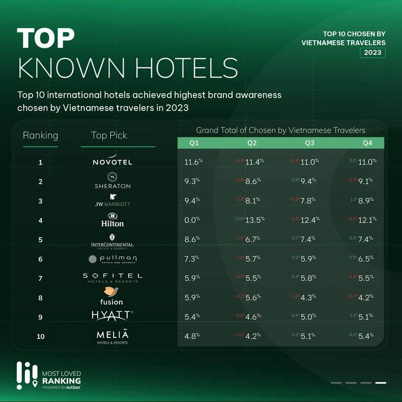Đối với hạng mục thương hiệu khách sạn quốc tế, du khách Việt vẫn ưa chuộng những tập đoàn quốc tế. Những lựa chọn top đầu thuộc về Novotel thuộc tập đoàn AccorHotels, Hilton của tập đoàn Blackstone và hai thương hiệu của Tập đoàn Marriott là Sheraton và JW Marriott.