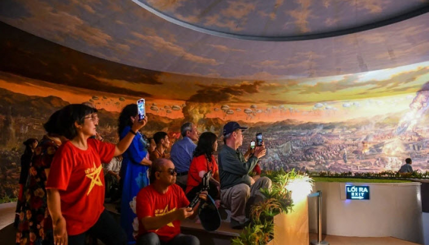 Du khách chiêm ngưỡng bức tranh Panorama tái hiện chiến dịch Điện Biên Phủ tại Bảo tàng Chiến thắng Điện Biên Phủ. (ẢNH: THÀNH ĐẠT)