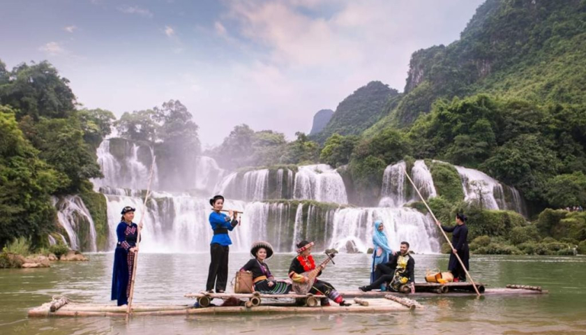 Du khách trải nghiệm các hoạt động tham quan tại thác Bản Giốc. Ảnh: Sở Văn hóa, Thể thao và Du lịch Cao Bằng