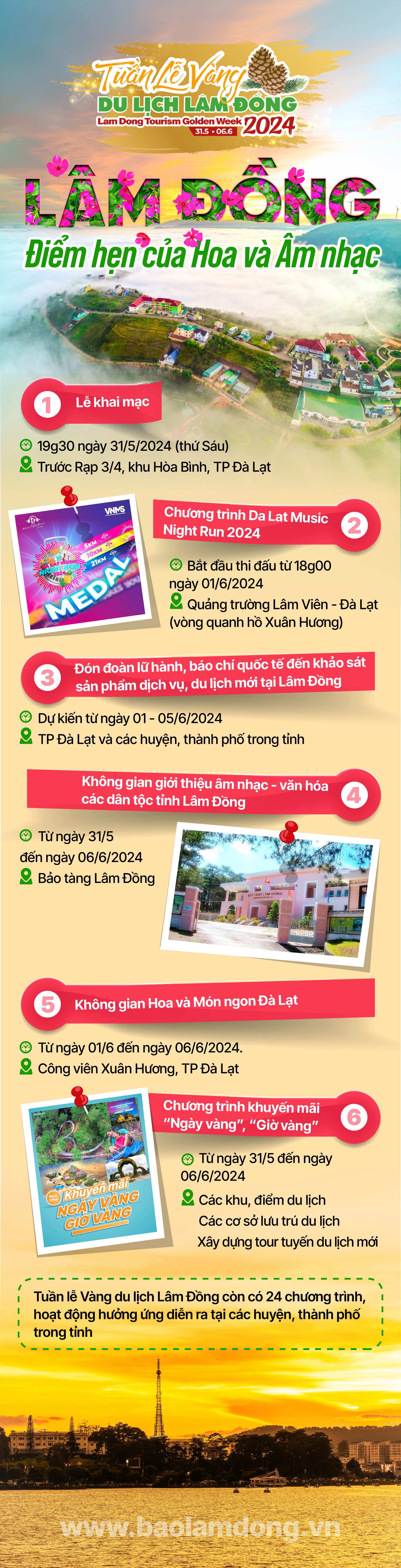 Tuần lễ Vàng Du lịch Lâm Đồng lần thứ 3 năm 2024 sẽ diễn ra từ ngày 31/5 đến ngày 6/6. Sự kiện nổi bật này của ngành du lịch Lâm Đồng trong năm 2024 bao gồm 7 chương trình chính và nhiều chương trình hưởng ứng, diễn ra trên địa bàn TP Đà Lạt, TP Bảo Lộc và một số huyện, hứa hẹn sẽ đem lại nhiều trải nghiệm thú vị cho người dân và du khách.