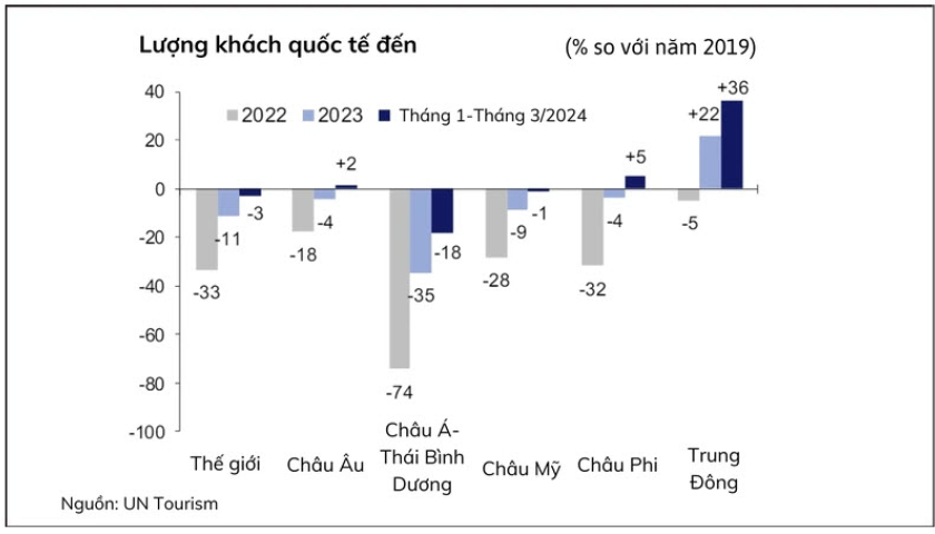 Trung Đông chứng kiến mức tăng trưởng mạnh nhất, với lượng khách quốc tế vượt 36% mức trước đại dịch trong quý 1/2024, cao hơn 4% so với cùng kỳ 2023.