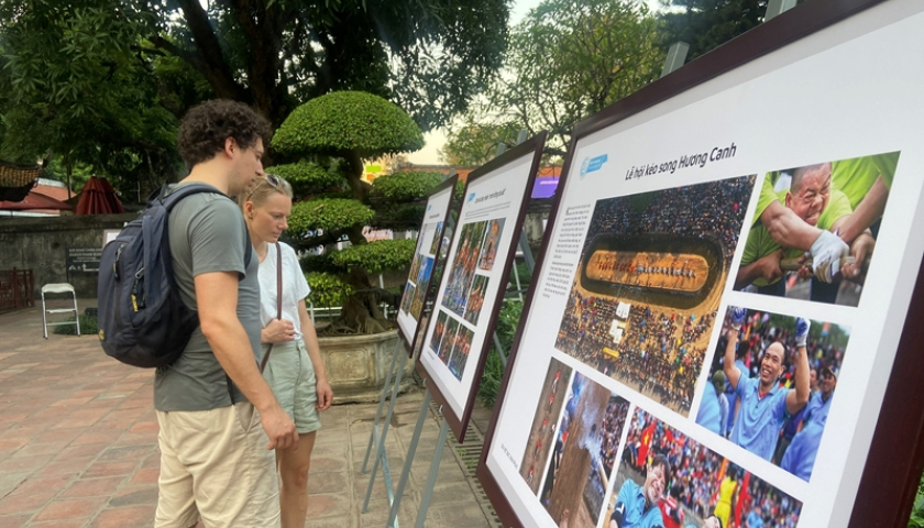 Khách quốc tế tham quan triển lãm tại Văn Miếu - Quốc Tử Giám. (Ảnh: HL)