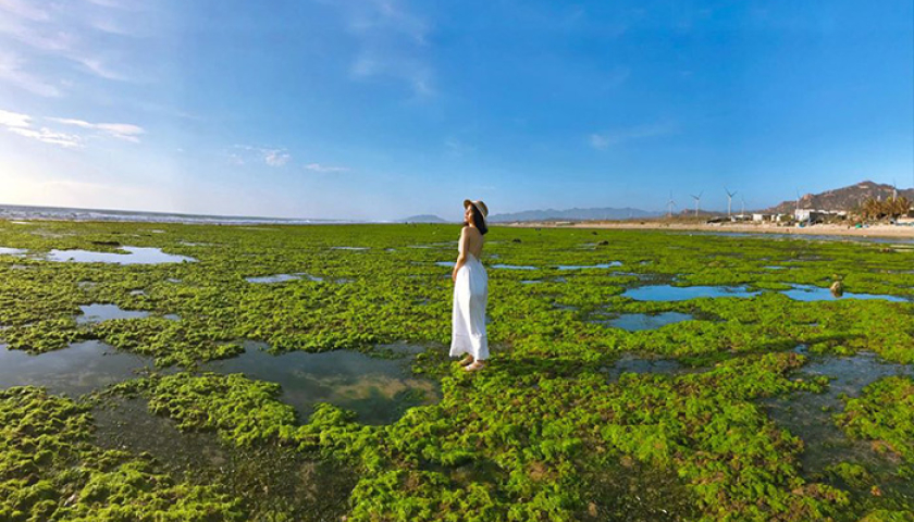 Tại một bãi biển thuộc Thôn Từ Thiện, xã Phước Dinh, huyện Thuận Nam, tỉnh Ninh Thuận, khi nước triều xuống thấp nhất cũng là lúc bãi rạn này hiện ra xanh ngát. Màu xanh của những thảm rong biển trải dài trên nền đá san hô.