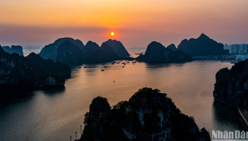 Hoàng hôn trên vịnh Hạ Long. (Ảnh: THÀNH ĐẠT)