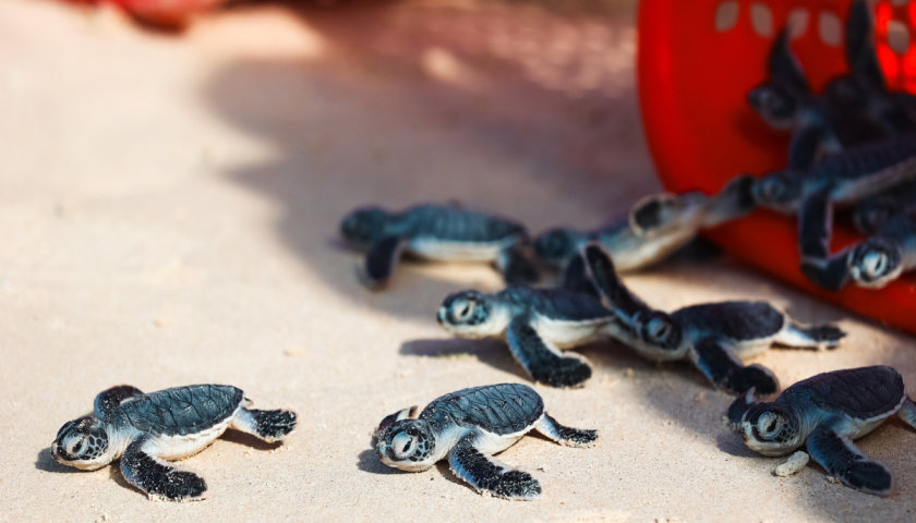 Từ tháng 4 đến tháng 11, trên 600 rùa mẹ lên các bãi cát thuộc Vườn quốc gia Côn Đảo (VQG) để làm tổ, đẻ trứng với trên 150.000 rùa con được cứu hộ và thả về biển, tỷ lệ trứng nở thành công đạt 87%. Vào mùa cao điểm, một số bãi biển ở hòn Bảy Cạnh, hòn Tre lớn ghi nhận 20 rùa mẹ lên làm tổ mỗi đêm. Du khách có thể tham gia các tour do Vườn quốc gia Côn Đảo tổ chức, quan sát quá trình rùa đẻ trứng vào ban đêm và hỗ trợ thả rùa con về biển. Ảnh: Vinh Gấu