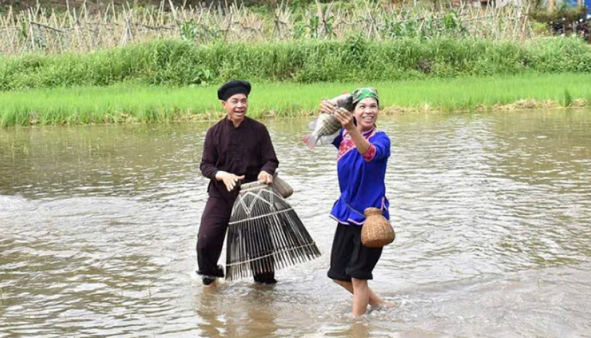 Du khách được trải nghiệm bắt cá bằng nơm khi đến với xã Tân Trào, huyện Sơn Dương, tỉnh Tuyên Quang.