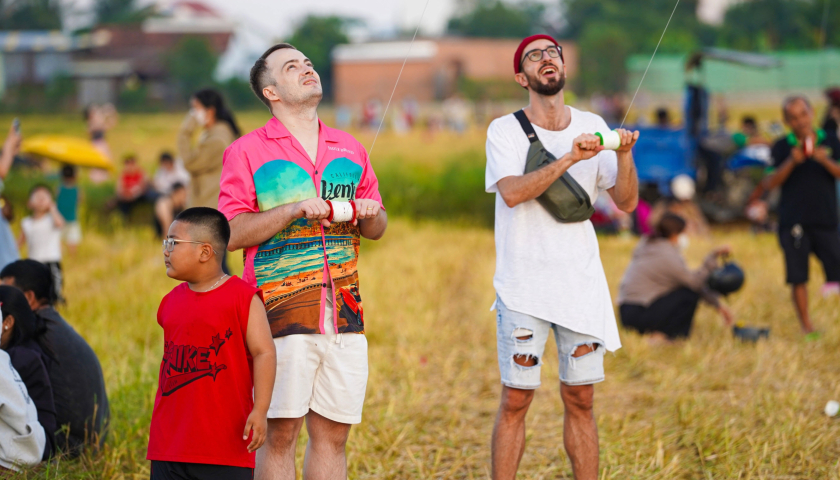 Hai du khách quốc tế thích thú trải nghiệm thả diều tại Khánh Hòa. Ảnh: Bùi Toàn