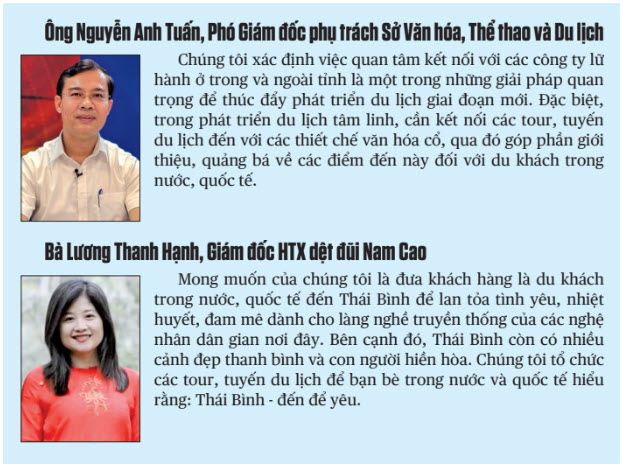 Mỗi không gian, mỗi vùng quê tại Thái Bình đều ẩn chứa những câu chuyện gần gũi với cuộc sống. Sự vào cuộc của các cấp chính quyền, các ngành chức năng, sự đồng thuận của nhân dân, các doanh nghiệp hoạt động trong lĩnh vực du lịch sẽ tạo nên những tour, tuyến, điểm đến ấn tượng thu hút du khách trong nước và quốc tế, góp phần phát triển du lịch trên mảnh đất Thái Bình.