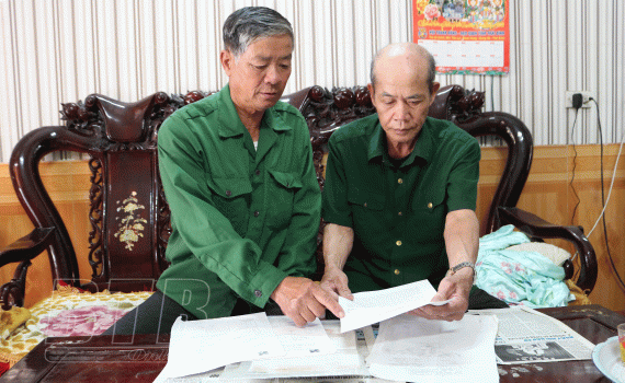 Chiến sĩ dân quân thuộc Trung đội pháo mặt đất 85 ly xã Đông Minh (Tiền Hải) ôn lại kỷ niệm chiến đấu.