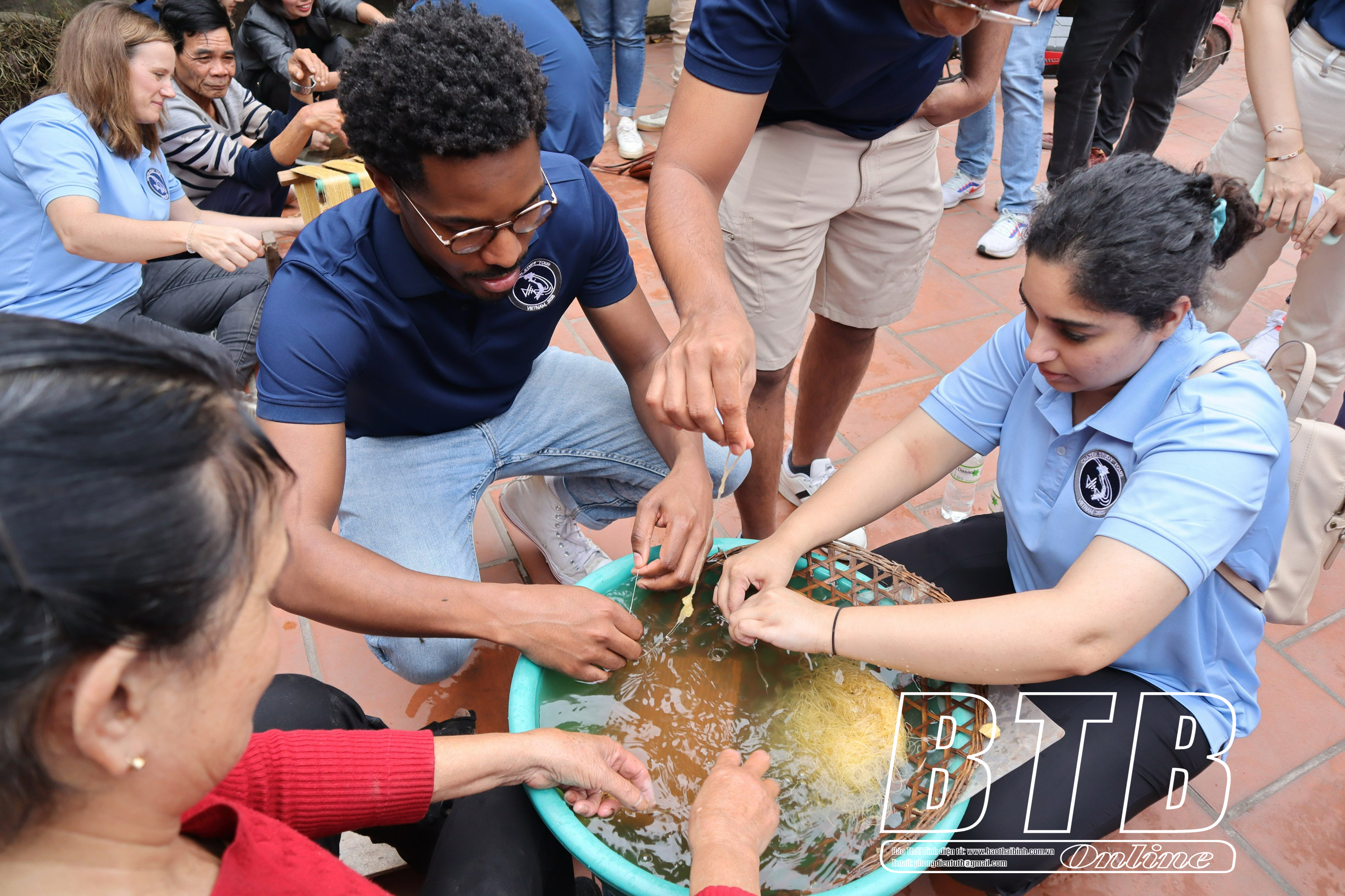 Du khách Mỹ tham quan, tìm hiểu tại làng nghề dệt đũi Nam Cao.