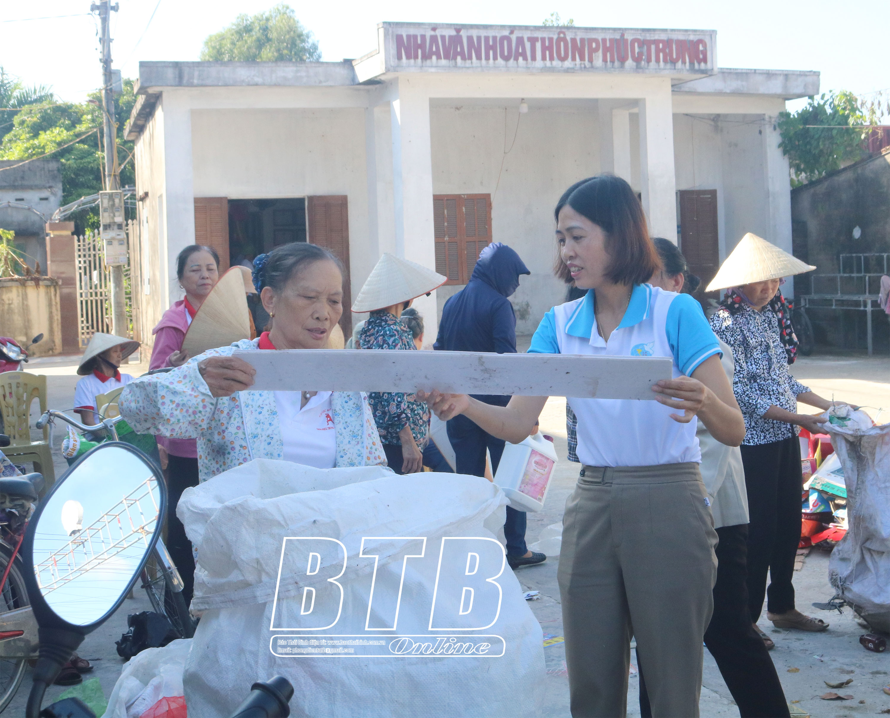 Chị Phạm Thị Phượng, Chủ tịch Hội LHPN xã Thái Phúc (người mặc áo xanh trắng) cùng chị em phụ nữ thôn Phúc Trung phân loại rác để bán gây quỹ hội.