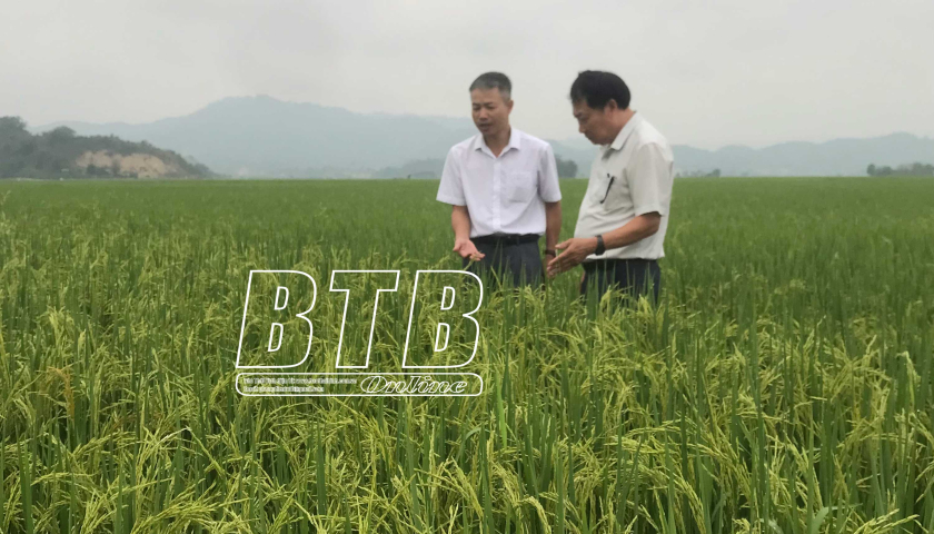 Bí thư Đảng ủy xã Buôn Tría Đào Quang Lâm (người bên trái) trao đổi về giống lúa năng suất 12 tấn/ha.