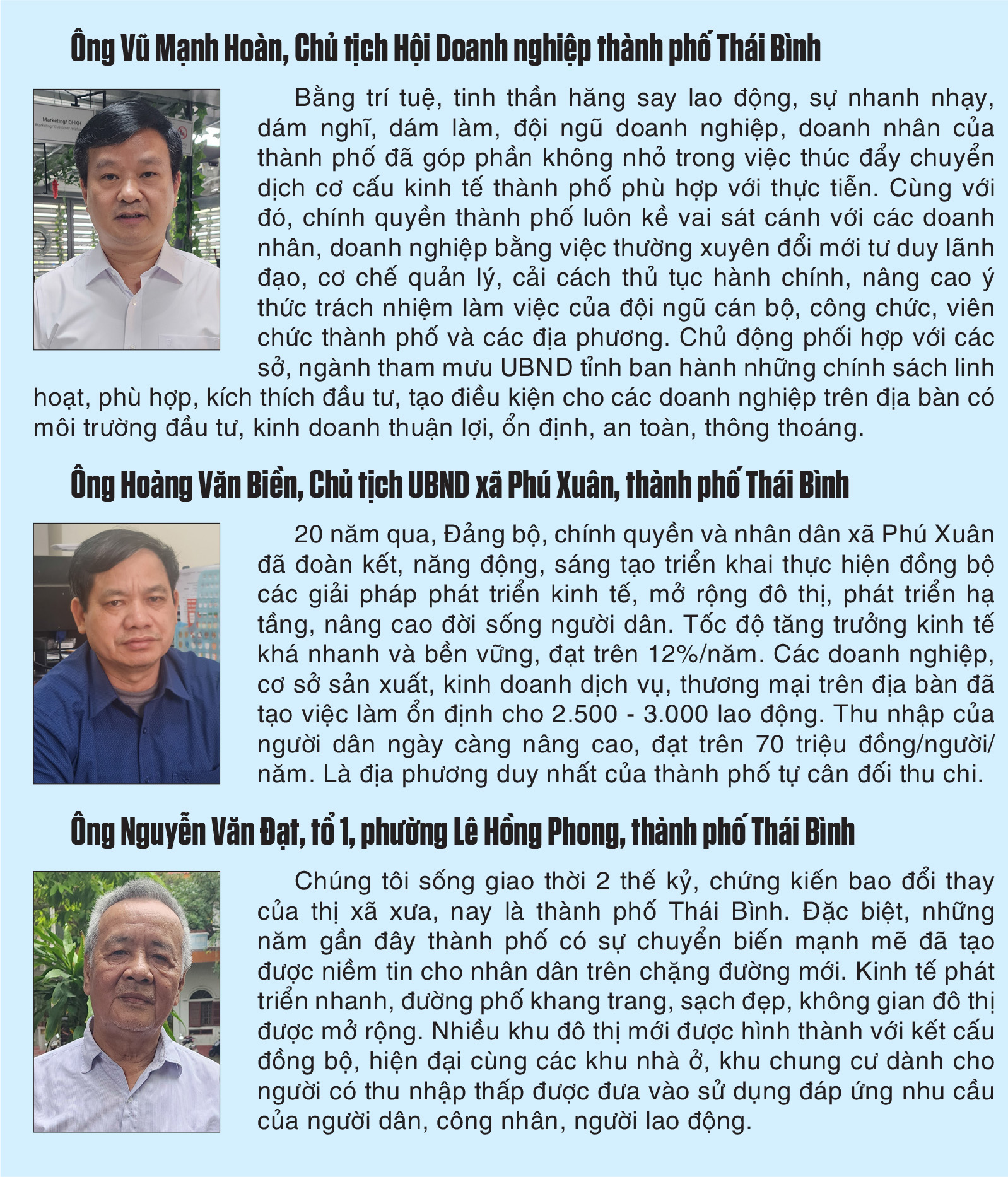 Sau 20 năm xây dựng và phát triển, thành phố Thái Bình đã đạt được nhiều thành tựu to lớn, toàn diện trên mọi lĩnh vực. Tình hình chính trị - xã hội luôn được giữ vững; kinh tế đạt tốc độ tăng trưởng cao, quy mô kinh tế được mở rộng, cơ cấu kinh tế chuyển dịch đúng hướng; các nguồn lực xã hội được phát huy; các ngành, lĩnh vực đều có bước phát triển vượt bậc.