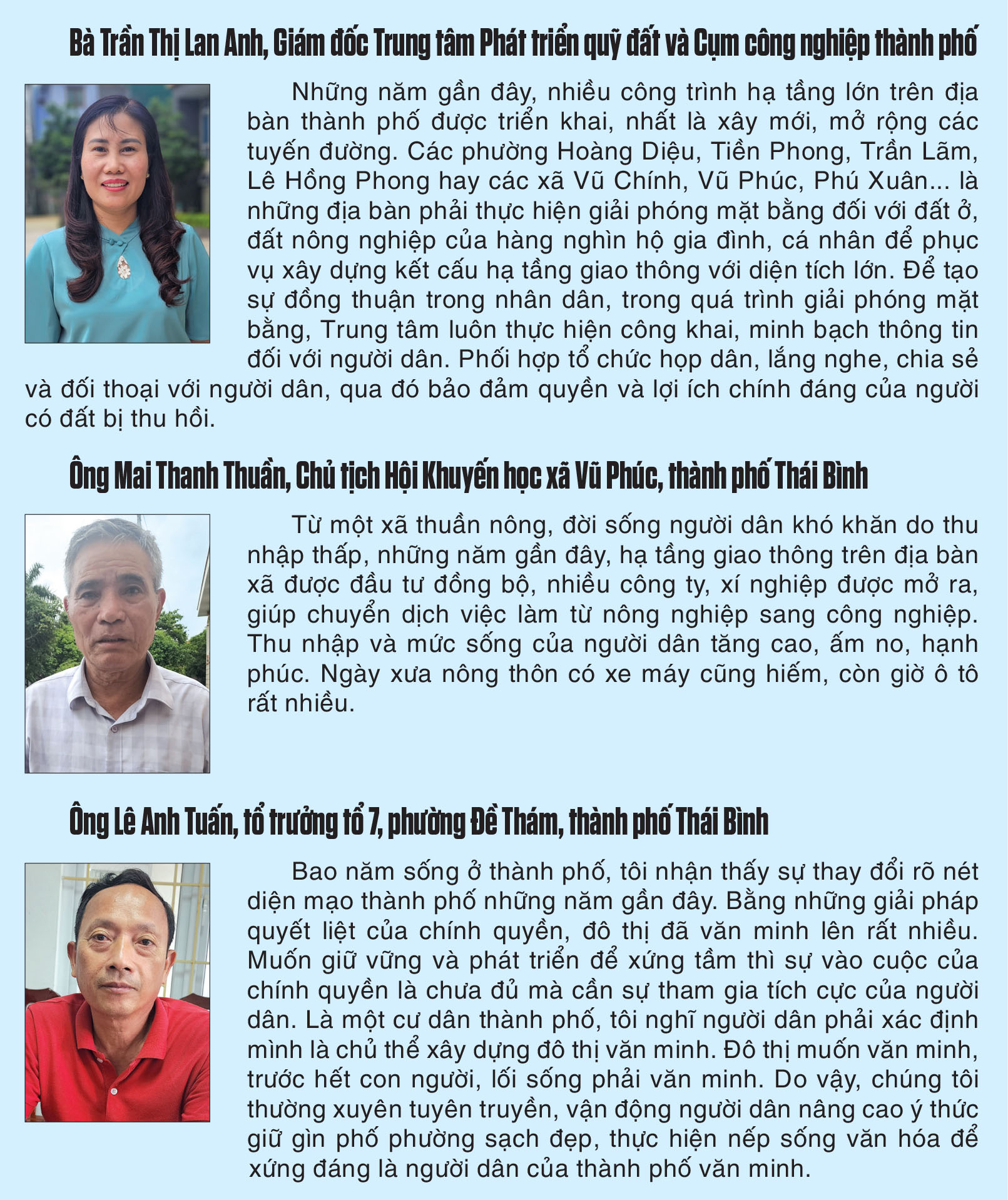 “Nhưng thay đổi bắt đầu từ đâu? Bất kỳ người dân các phường: Kỳ Bá, Trần Lãm, Quang Trung, Phú Khánh, Hoàng Diệu hay các xã Phú Xuân, Vũ Chính, Vũ Phúc, Vũ Đông, Đông Mỹ... đều có thể chỉ ra nguồn gốc của sự thay đổi ấy, đó là từ khi có các khu công nghiệp: Nguyễn Đức Cảnh, Phúc Khánh, Sông Trà, Gia Lễ, từ khi có các tuyến đường trục kết nối, các khu đô thị, khu nhà ở xã hội cao tầng, các trung tâm thường mại... Thành phố giờ đã trở thành một điểm đến, điểm dừng chân của những nhà đầu tư nước ngoài tìm cơ hội tốt; điểm đến của những người thành đạt tìm môi trường sống tốt; điểm đến của lực lượng lao động tìm việc làm tốt, cơ hội để các bạn trẻ trở về quê hương khởi nghiệp. Thay đổi nhanh lắm, người dân như tôi chứng kiến từ đầu mà còn không ngờ. Thành phố đang từng ngày hoàn thiện vóc dáng của một đô thị văn minh, xanh, sạch, khẳng định vai trò trung tâm chính trị, kinh tế, văn hóa, xã hội của tỉnh” - ông Trần Đức Tuấn, tổ 6, phường Quang Trung cho biết.