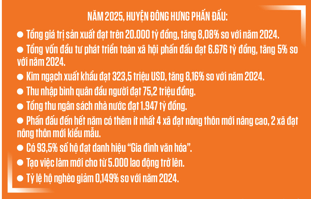 Có được kết quả trên là do huyện đã phát huy tiềm năng, thế mạnh để phát triển kinh tế - xã hội của địa phương. “Trụ cột” nông nghiệp vẫn được xác định là thế mạnh vì hiện huyện có tổng diện tích gieo trồng trên 30.000ha; năng suất lúa luôn trong tốp dẫn đầu toàn tỉnh; có trên 1.200ha đất được tích tụ quy mô 1ha trở lên. Với những cơ chế, chính sách hỗ trợ của tỉnh, huyện, nhiều mô hình sản xuất giống lúa mới, mô hình sản xuất nông nghiệp công nghệ cao, nông nghiệp xanh, vùng sản xuất VietGAP, xây dựng sản phẩm OCOP gắn với phát triển du lịch nông thôn được các tổ chức, cá nhân, địa phương mạnh dạn triển khai, mang lại hiệu quả cao, mở ra hướng đi mới trong phát triển nông nghiệp bền vững trên địa bàn. Hết năm 2024, toàn huyện có khoảng 25 sản phẩm OCOP 3, 4 sao. Đến nay, huyện có 2 xã Đông Phương và Đông Hoàng đạt nông thôn mới nâng cao, một số xã đã hoàn thành các tiêu chí nông thôn mới nâng cao đang hoàn thiện hồ sơ đề nghị tỉnh thẩm định.