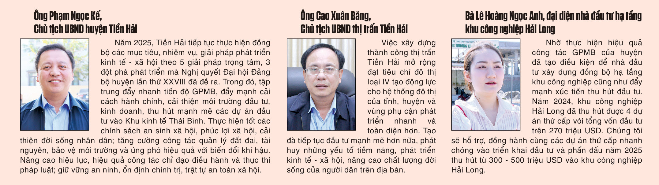 Năm 2024, Tiền Hải đã tập trung chỉ đạo, tháo gỡ các vướng mắc để đẩy nhanh tiến độ giải phóng mặt bằng (GPMB) các dự án, nhất là các dự án trọng điểm như khu công nghiệp Hải Long, khu công nghiệp Hưng Phú. Trong đó, khu công nghiệp Hải Long đến cuối năm 2023 đã GPMB xong đợt 1 với diện tích trên 30ha; đến tháng 7/2024, đã hoàn thành việc chi trả tiền tạm ứng GPMB đợt 2 với diện tích 100ha. Đặc biệt, khu công nghiệp Hưng Phú chỉ sau 35 ngày kể từ khi dự án bắt đầu triển khai huyện đã thực hiện xong việc tạm ứng tiền chi trả GPMB cho 754 hộ dân trên địa bàn xã Nam Hưng (nơi triển khai dự án) với tổng diện tích 100ha.