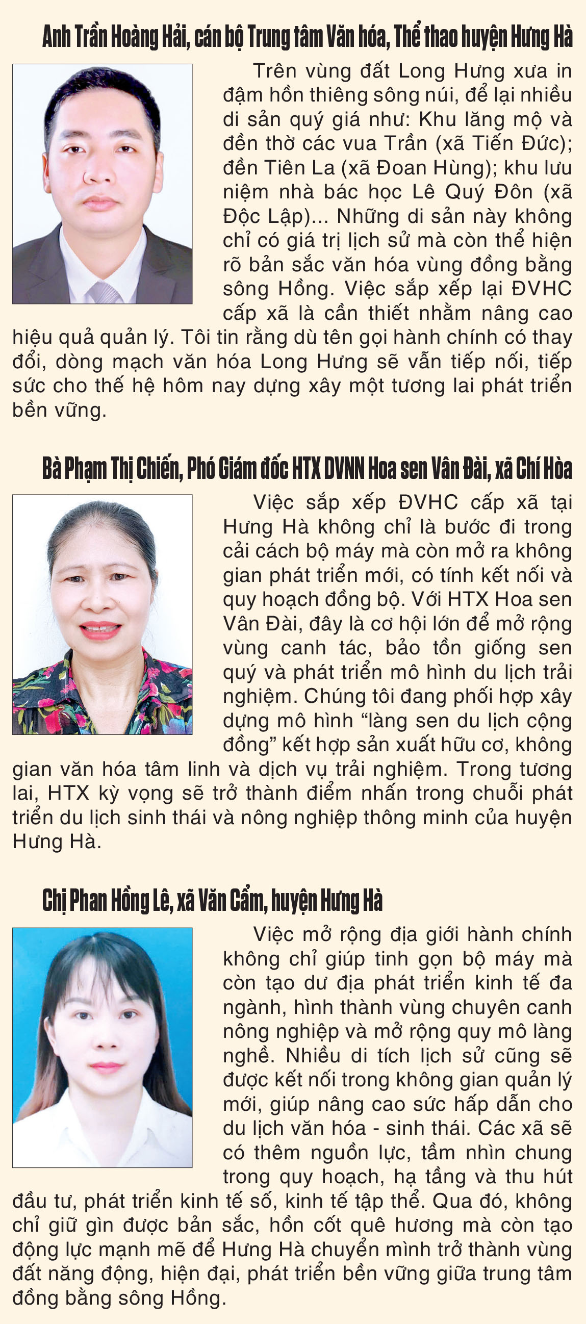 Ông Nguyễn Tiến Hoạt, Trưởng phòng Giáo dục và Đào tạo huyện Hưng Hà cho biết: Mỗi tên gọi của các xã mới không chỉ là một ĐVHC đơn thuần mà còn là những mạch nguồn lịch sử, một phần không thể tách rời của di sản văn hóa, là niềm tự hào của nhân dân nơi đây. Chúng tôi tiếp tục tổ chức nhiều hoạt động ngoại khóa, cuộc thi tìm hiểu về tên xã, các buổi giao lưu với người cao tuổi để kể lại những câu chuyện lịch sử đặc sắc, giúp học sinh hiểu rõ hơn về lịch sử và văn hóa địa phương. Những tên gọi mới sẽ trở thành bài học sinh động về sự kết nối giữa các thế hệ và là động lực thúc đẩy các em hiểu và tự hào về mảnh đất mình đang sống.
