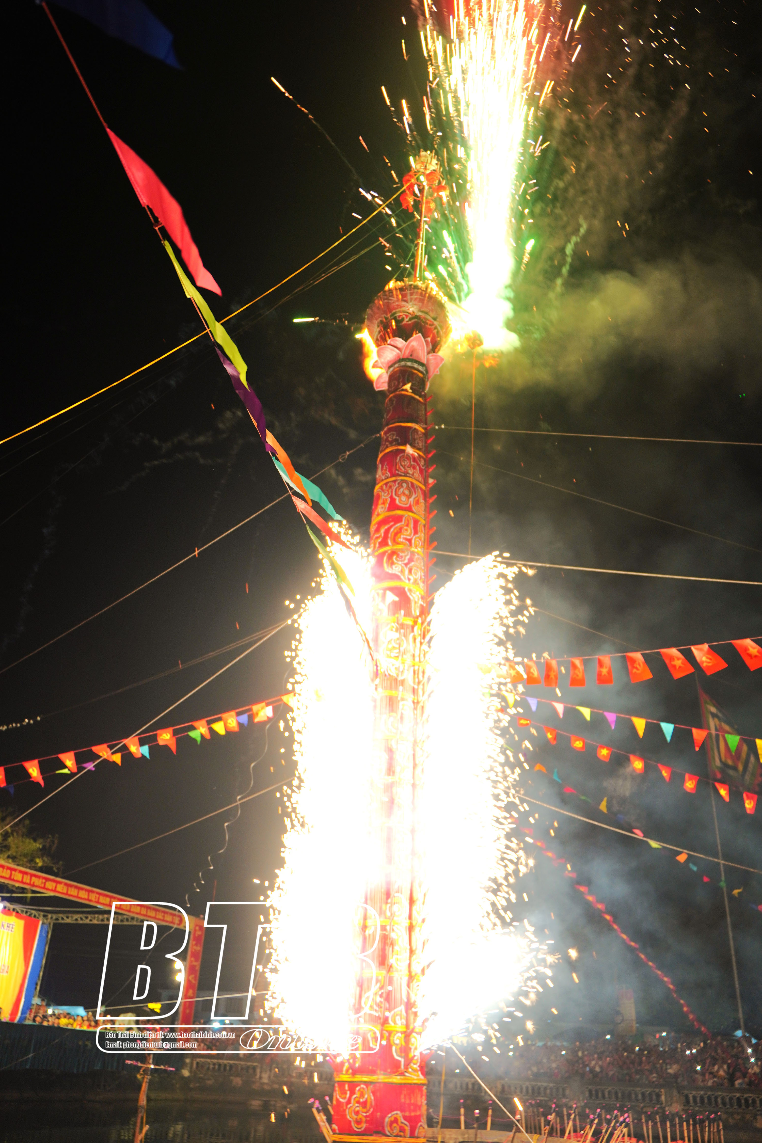 Trong đêm lễ hội, dưới sự chứng kiến của dân làng và du khách thập phương, bậc cao niên của làng Lộng Khê thực hiện nghi thức rước bó đuốc từ cung cấm đền ra khu vực dựng cây Đình Liệu, kính cẩn nghiêng mình làm lễ và thực hiện châm đuốc. Lúc này, trong tiếng hò reo rộn ràng khắp không gian, trai làng lấy hết sức kéo ngọn lửa lên vị trí cao nhất của cây Đình Liệu. Khi ngọn lửa rực cháy giữa trời đêm, cả không gian bừng sáng, nhân dân thành kính hướng về lễ hội truyền thống, cầu mong dân khang, vật thịnh.