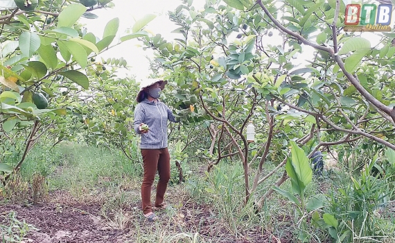 Với diện tích hơn 9.000m2, chị Hoa chia làm 3 khu với những giống cây trồng và vật nuôi khác nhau. Khu diện tích 1.500m2 trồng 300 cây ổi Đài Loan và ổi găng Đông Dư. Chỉ sau một năm, mỗi cây ổi cho 20kg quả, trừ chi phí chị thu về trên 20 triệu đồng. Khu chuyên sản xuất cây màu với diện tích 3.000m2 luân canh từ 3 - 4 vụ/năm, mỗi vụ cho giá trị từ 30 - 40 triệu đồng, trừ chi phí chị thu về khoảng 20 triệu đồng/năm. Khu còn lại 4.500m2 chị xây dựng chuồng trại chăn nuôi và trồng cỏ, đồng thời trồng xen thí điểm 60 gốc mít và 110 gốc bưởi da xanh.
