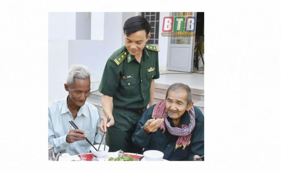 Đồn trưởng Bùi Trung Úy tổ chức cho đồng bào Khmer có hoàn cảnh khó khăn ăn tết Chol Chnam Thmay tại đơn vị.