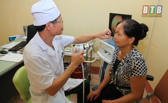 Đại tá Đỗ Văn Bình khám cho người bệnh tại khoa Tai – Mũi - Họng.