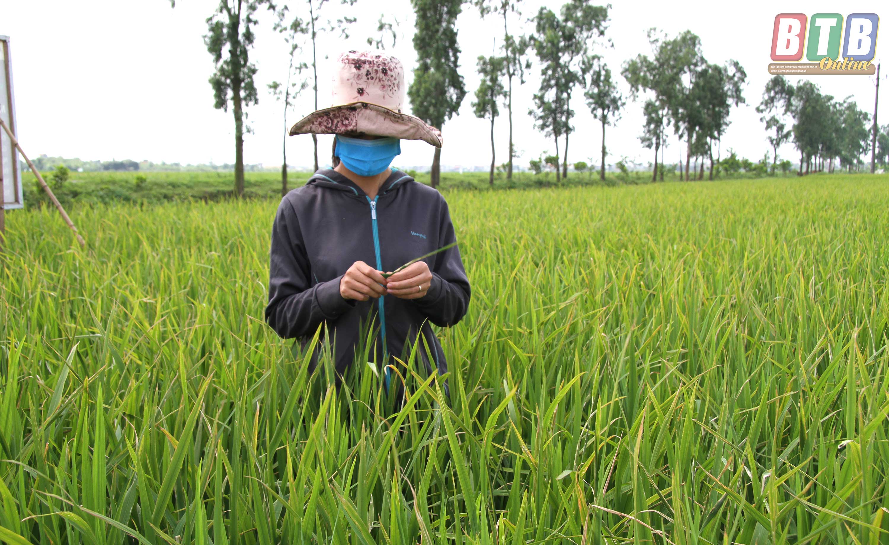 Cán bộ Trạm Trồng trọt và Bảo vệ thực vật huyện Đông Hưng kiểm tra tình hình sâu bệnh trên đồng ruộng.