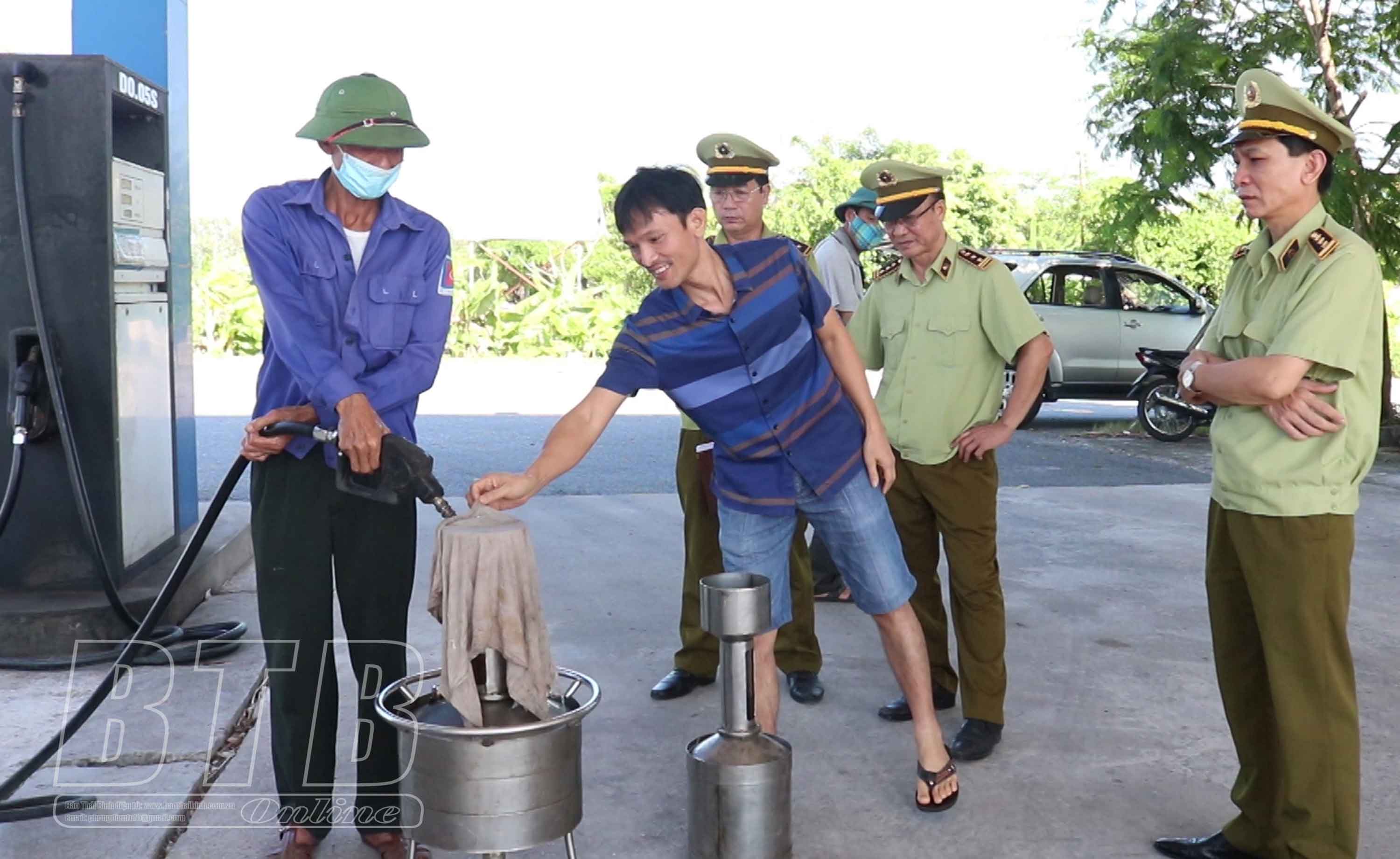 Lực lượng Quản lý thị trường phối với Chi cục Tiêu chuẩn Đo lường Chất lượng (Sở Khoa học Công nghệ) kiểm tra thiết bị đo và chất lượng xăng dầu tại cửa hàng xăng dầu Quang Bình, huyện Kiến Xương. Ảnh tư liệu