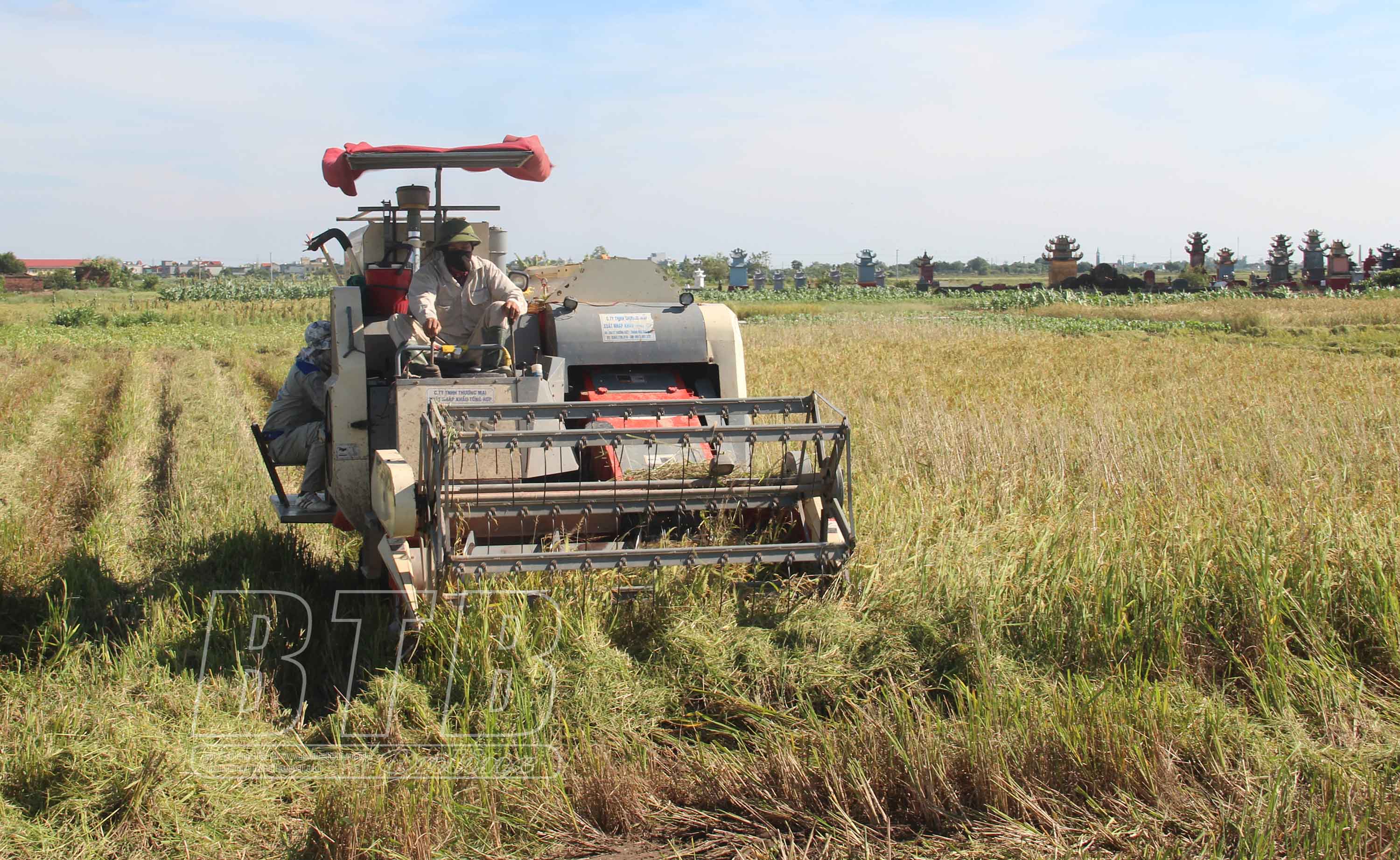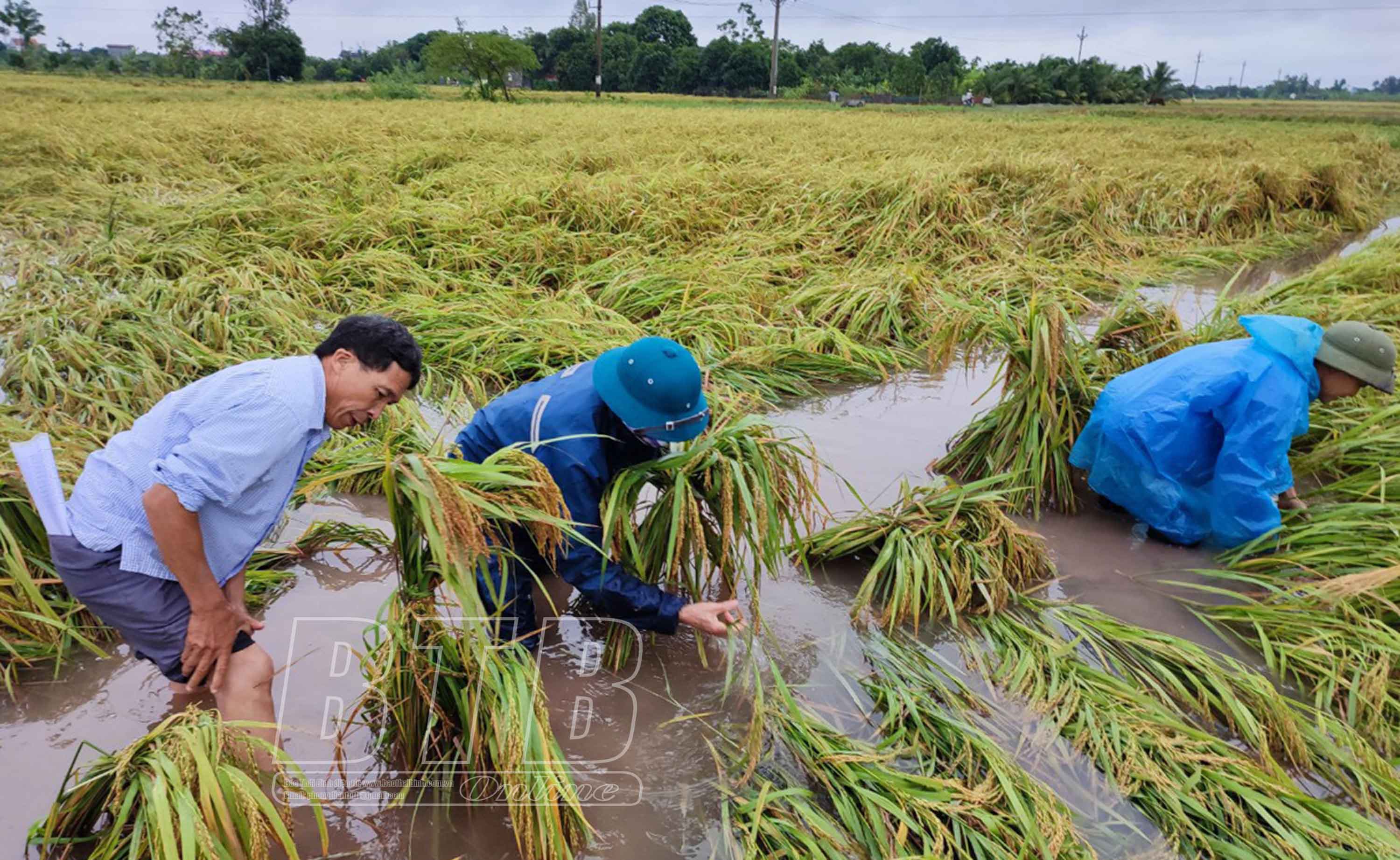 Nông dân xã Minh Khai (Vũ Thư) thu hoạch lúa mùa. Xã Quỳnh Hồng (Quỳnh Phụ) huy động trên 50 hội viên các đoàn thể tham gia cùng người dân buộc dựng 20ha lúa, thu hoạch 5ha bị đổ.