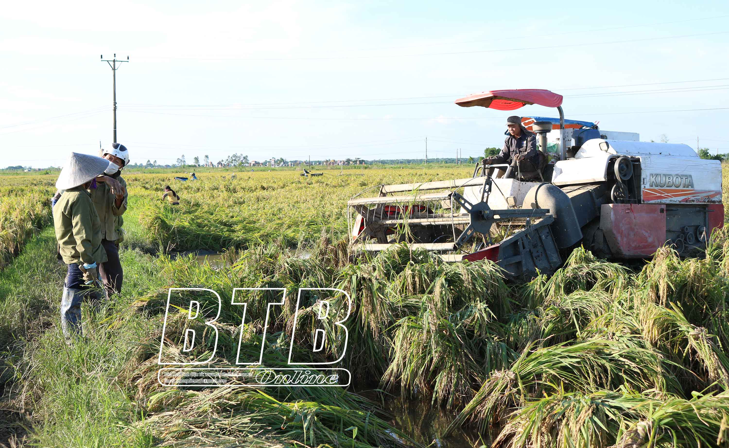 Nông dân xã Thụy Duyên (Thái Thụy) khẩn trương thu hoạch lúa mùa.Huyện Thái Thụy huy động hơn 200 máy gặt khẩn trương thu hoạch lúa.