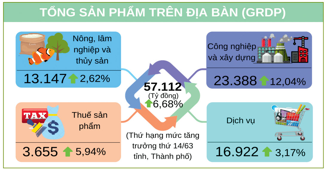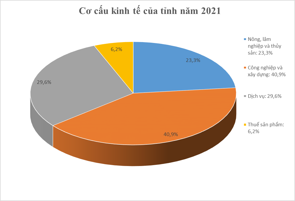 Nếu như năm 2020, tổng sản phẩm trên địa bàn (GRDP) tăng 3,23% so với năm 2019 thì kết thúc năm 2021, GRDP của tỉnh tăng 6,68% so với năm 2020, cao hơn mức bình quân chung của cả nước. Các nhiệm vụ và các chỉ tiêu, mục tiêu đề ra trong năm 2021 cơ bản hoàn thành, trong đó có nhiều chỉ tiêu vượt kế hoạch đề ra. Nổi bật nhất phải kể đến là sự tăng trưởng mạnh mẽ của lĩnh vực công nghiệp với giá trị sản xuất ước đạt 80.849 tỷ đồng, tăng 17% so với năm 2020, vượt 1,2% so với kế hoạch đề ra; kim ngạch xuất khẩu ước đạt 2.069 triệu USD, tăng 23,5% so với năm 2020, vượt 14,3% so với kế hoạch đề ra; kim ngạch nhập khẩu ước đạt 1.632 triệu USD, tăng 21,3% so với năm 2020, vượt 11,6% so với kế hoạch đề ra.