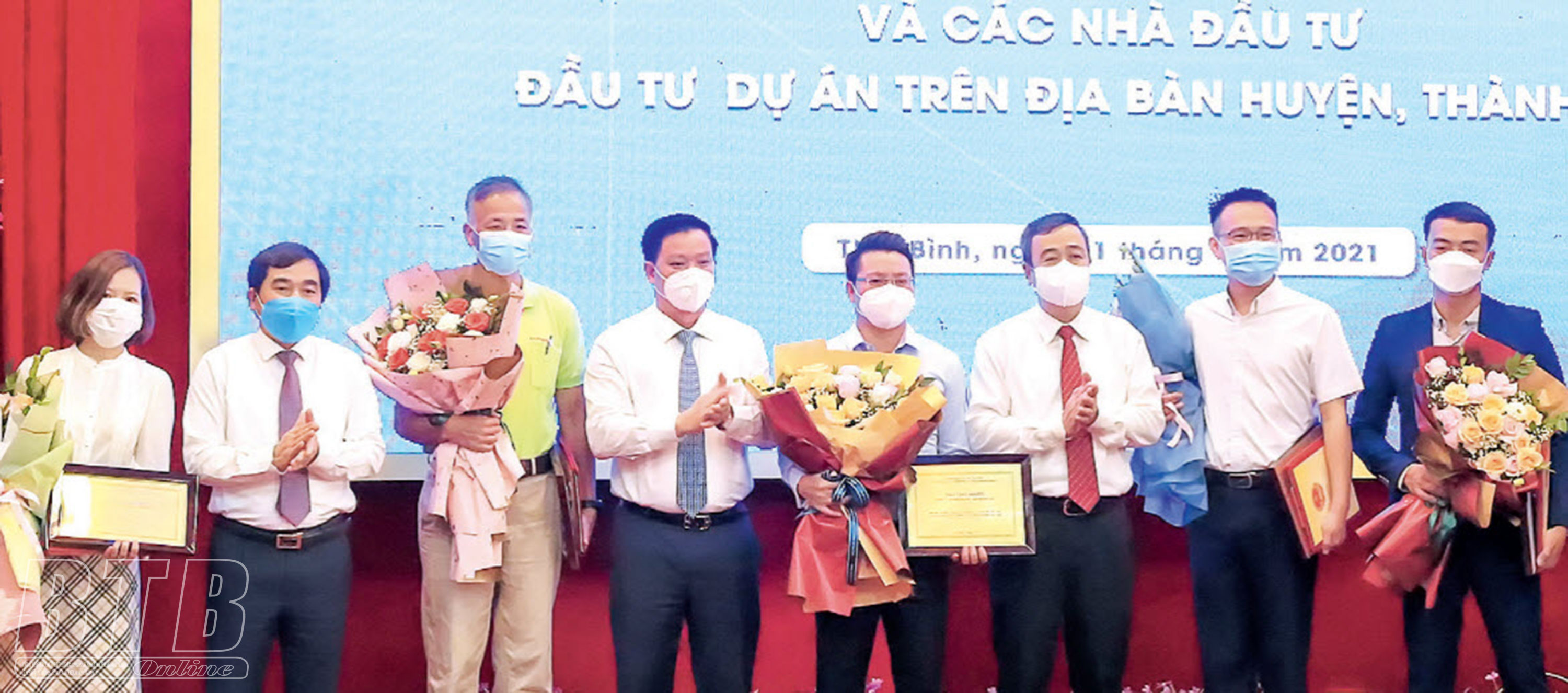 Các đồng chí lãnh đạo tỉnh trao giấy chứng nhận và tặng hoa chúc mừng các nhà đầu tư thứ cấp đầu tư vào Khu kinh tế Thái Bình và các nhà đầu tư dự án trên địa bàn huyện, thành phố, ngày 1/9/2021. Ảnh: Thành Tâm