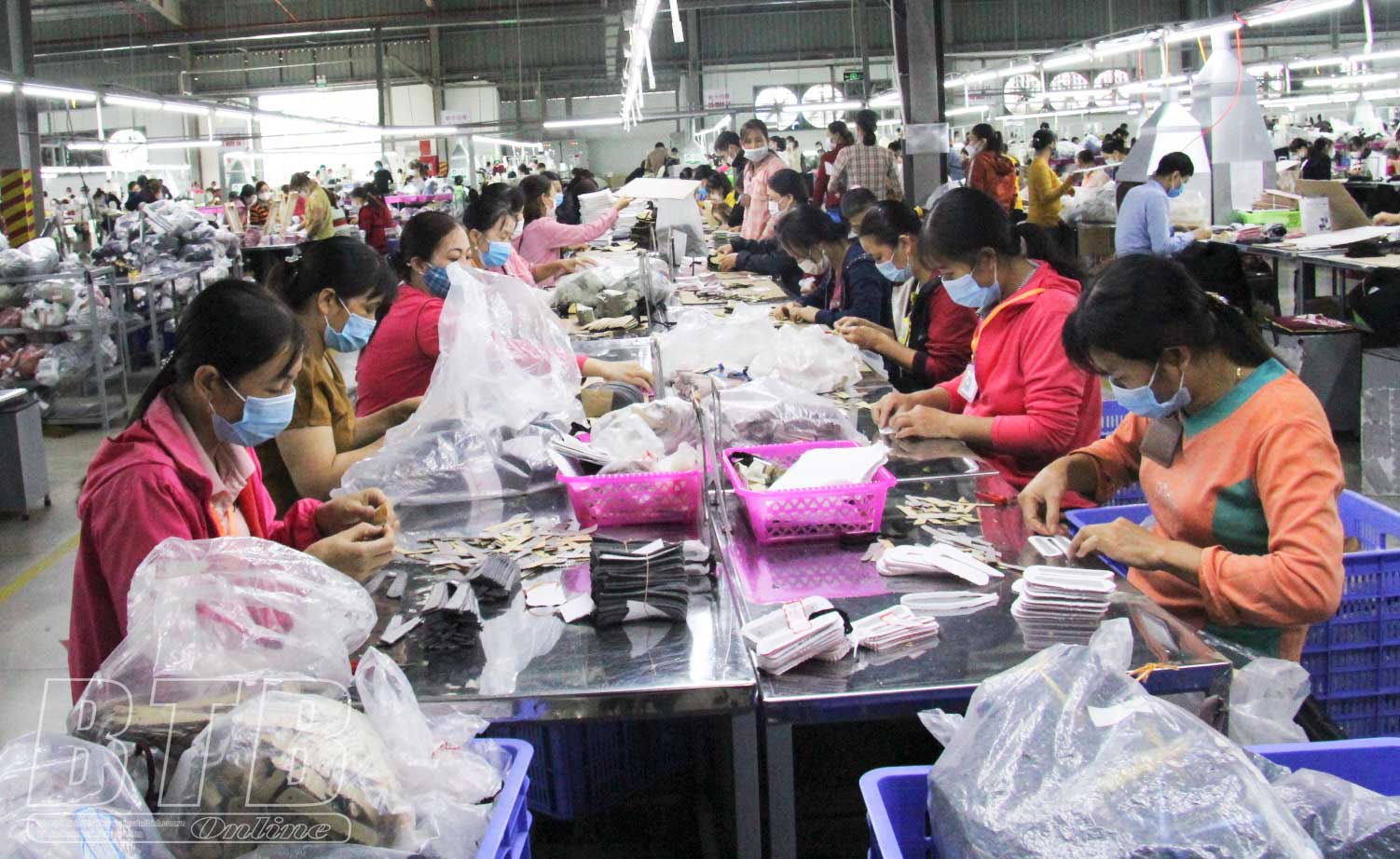 Cũng như nhiều doanh nghiệp khác trong huyện, những ngày đầu xuân Nhâm Dần 2022, tại Công ty Bảo Ngọc Minh (xã Hồng Lĩnh) chuyên gia công giày dép, may mặc xuất khẩu và xây dựng kho bãi cho các nhà đầu tư thuê, hàng trăm công nhân tại các dây chuyền sản xuất đang hoạt động hết công suất để kịp cho đơn hàng đầu tiên xuất khẩu đi nước ngoài.