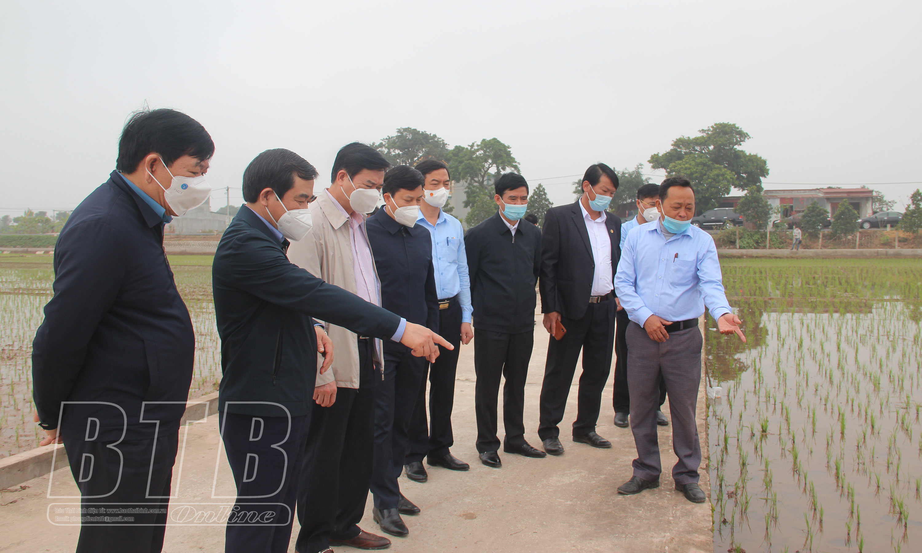 Cũng trong sáng ngày 3/3, các đồng chí lãnh đạo tỉnh đã kiểm tra, chỉ đạo công tác sản xuất vụ xuân của huyện Hưng Hà. Theo báo cáo của Phòng Nông nghiệp và Phát triển nông thôn huyện, vụ xuân năm nay, huyện Hưng Hà gieo cấy 10.560ha trong đó nhóm giống lúa năng suất cao chiếm trên 60% diện tích. Đợt rét đậm, rét hại từ ngày 19 – 22/2, toàn huyện có 600ha lúa xuân bị ảnh hưởng trong đó có 30ha phải cấy lại ở các xã: Hồng Minh, Độc Lập, Thái Phương, Minh Khai… Đến nay, nông dân trong huyện đã khắc phục xong ảnh hưởng của rét đậm, rét hại, tập trung các biện pháp chăm sóc.