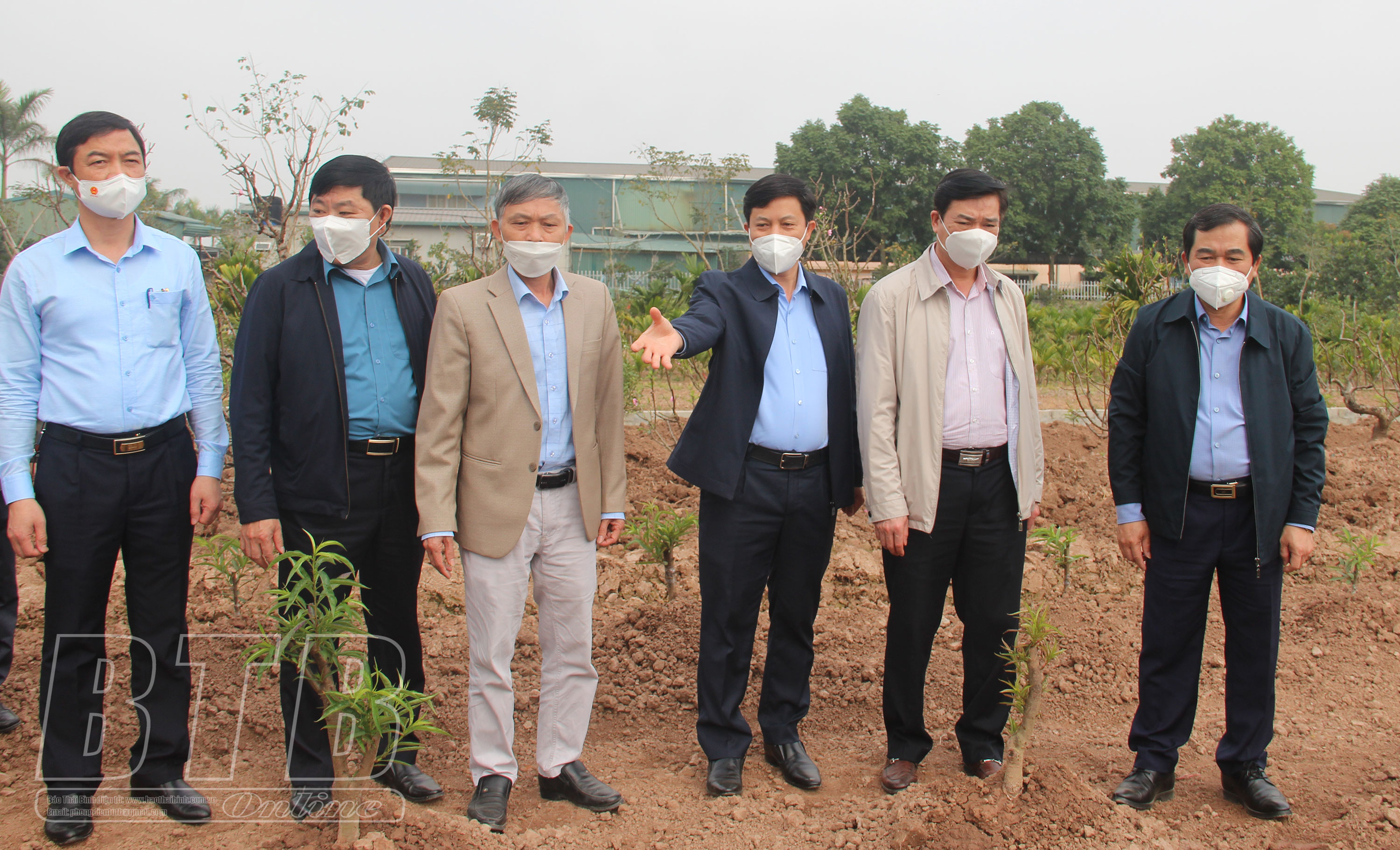 Các đồng chí lãnh đạo tỉnh thăm mô hình chuyển đổi đất lúa kém hiệu quả sang sản xuất cây giống tại xã Hồng Việt (Đông Hưng).