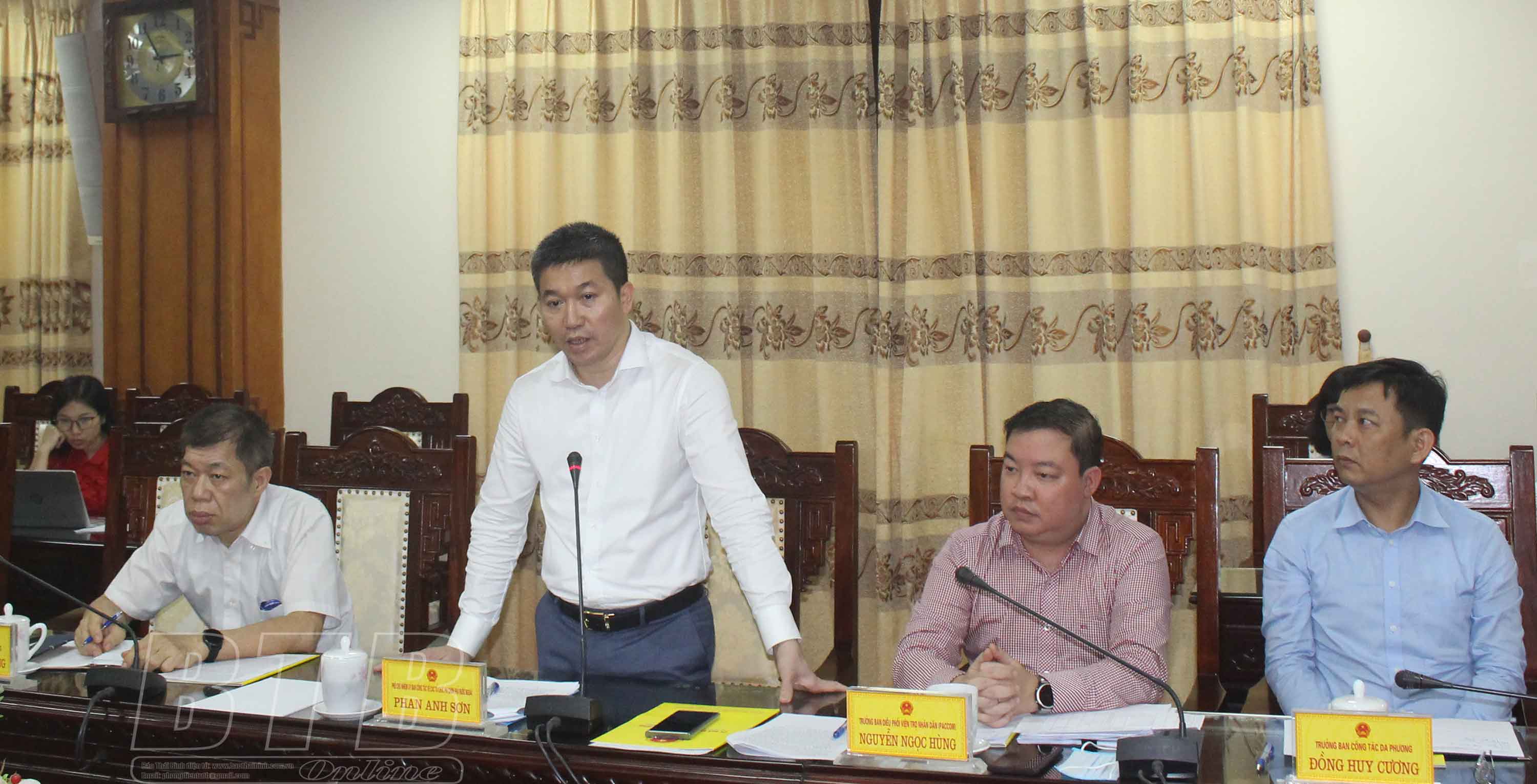 Thay mặt đoàn công tác, đồng chí Phan Anh Sơn, Phó Chủ nhiệm Ủy ban Công tác về các tổ chức PCPNN, Phó Chủ tịch Liên hiệp Các tổ chức hữu nghị Việt Nam đề nghị tỉnh Thái Bình tổng hợp các đề xuất cụ thể làm cơ sở để Ủy ban Công tác về các tổ chức PCPNN làm việc với các tổ chức PCPNN, đồng thời đề xuất với Ủy ban Công tác về các tổ chức PCPNN về nhu cầu đào tạo, tập huấn nâng cao kỹ năng, năng lực cho cán bộ làm công tác vận động, quản lý, sử dụng viện trợ của địa phương.