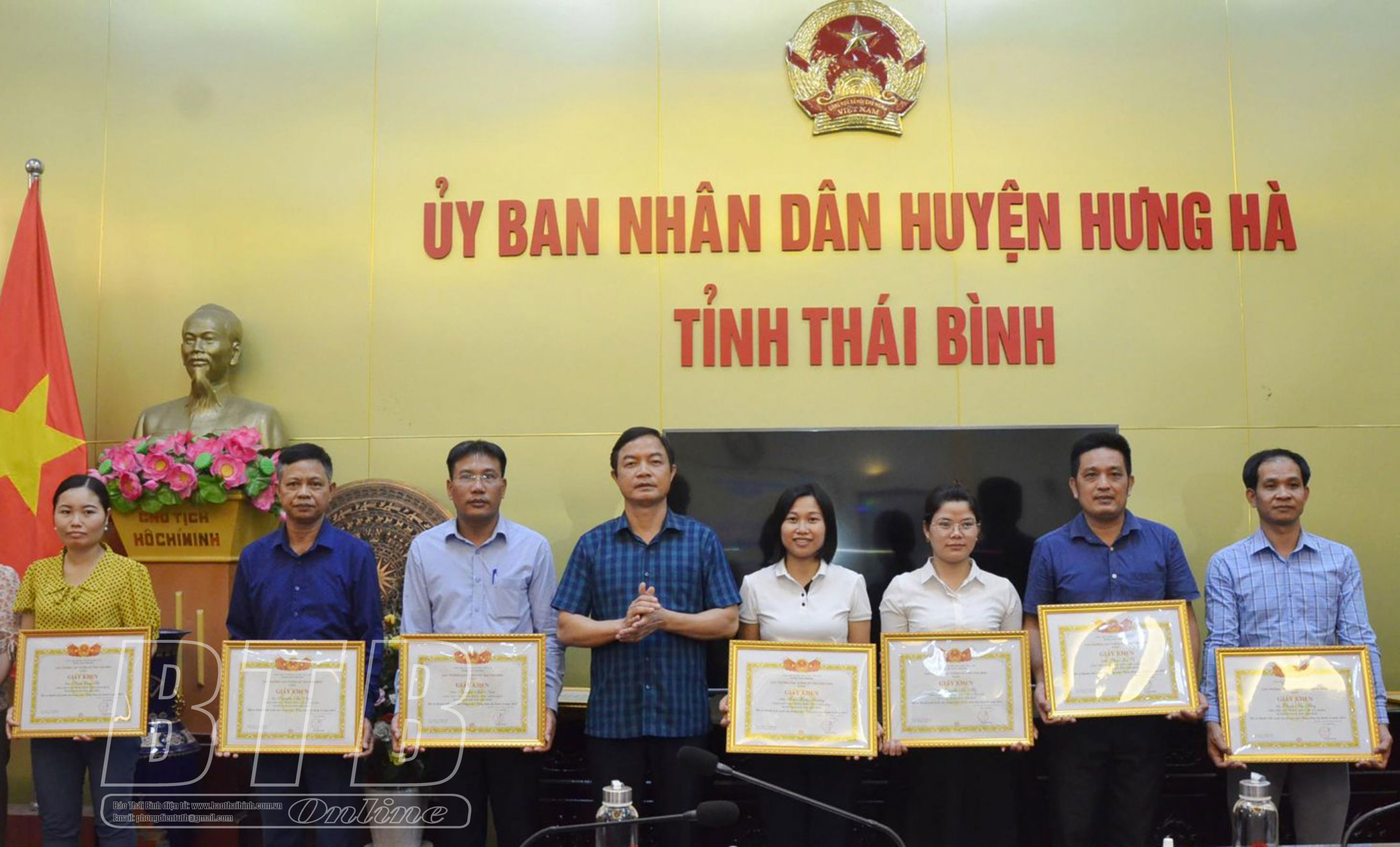Lãnh đạo UBND huyện Hưng Hà trao giấy khen cho các cá nhân có thành tích suất sắc trong công tác tổng điều tra kinh tế năm 2021.