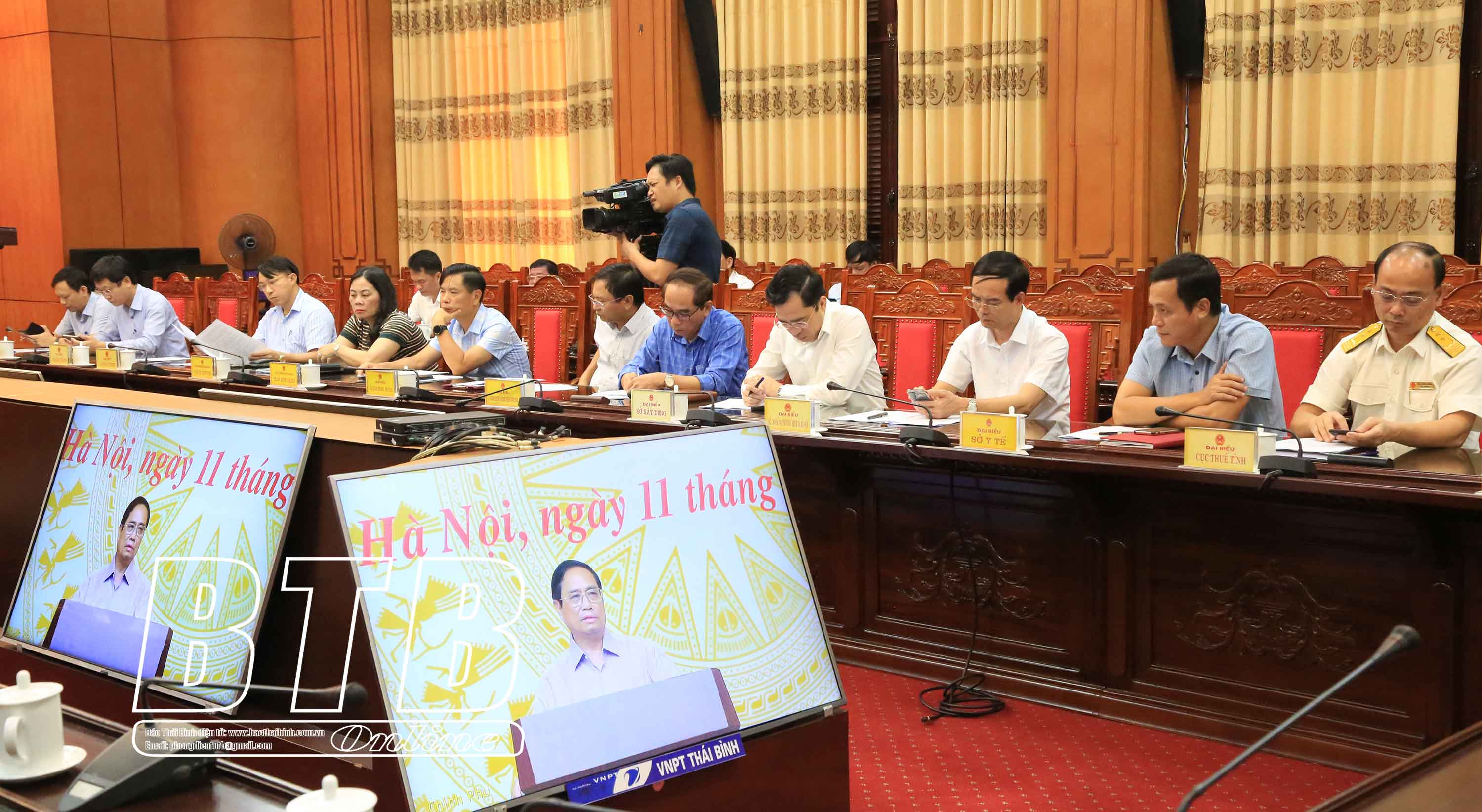 Các đồng chí: Nguyễn Khắc Thận, Phó Bí thư Tỉnh ủy, Chủ tịch UBND tỉnh; Vũ Kim Cứ, Ủy viên Ban Thường vụ, Giám đốc Sở Kế hoạch và Đầu tư dự hội nghị tại điểm cầu tỉnh Thái Bình.